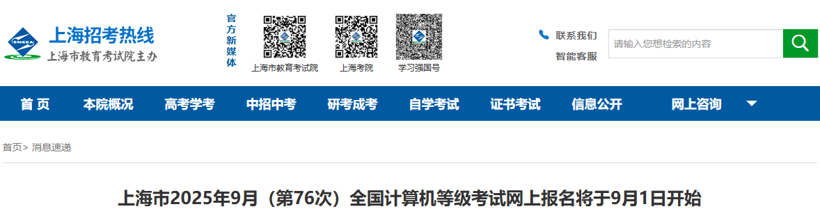 上海市2025年9月(第76次)全國計算機等級考試網上報名將于9月1日開始